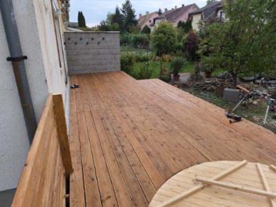 A fa házhoz épített terasz praktikus is: megfelelő kezeléssel hosszú éveken át ellenáll az időjárás viszontagságainak, és minimális karbantartást igényel.